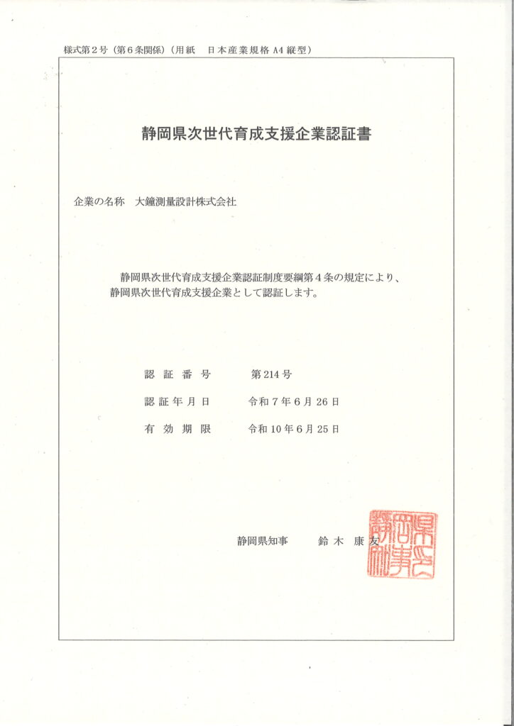 静岡県次世代育成支援企業(こうのとりカンパニー)の認証を受けました。